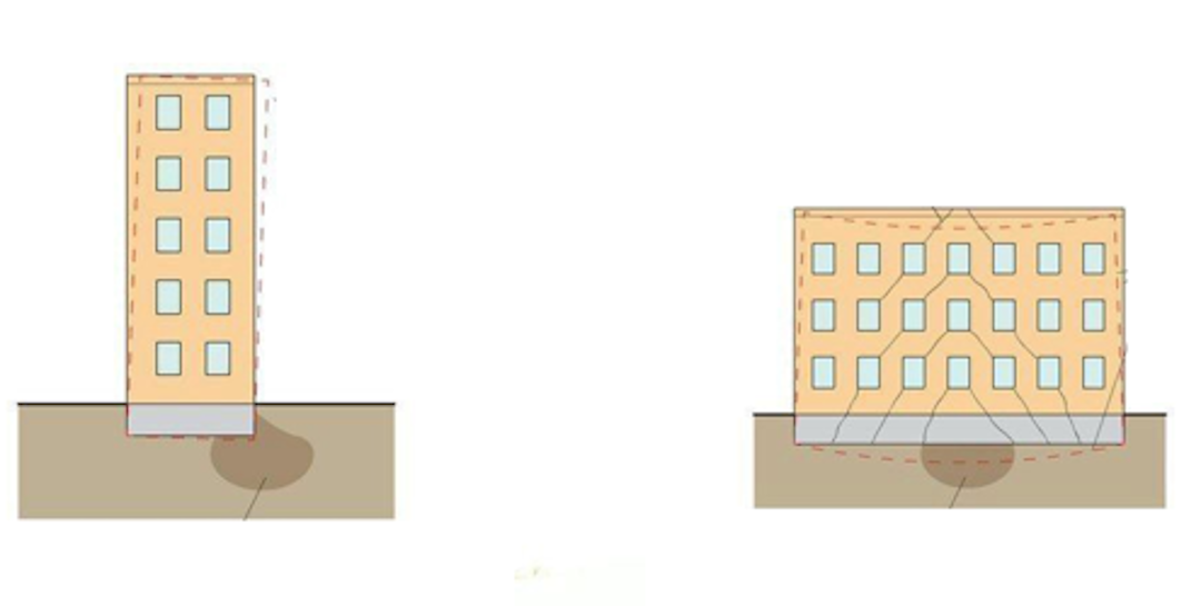 В зданиях с низкой собственной жесткостью при снижении жесткости основания будут развиваться трещины, вплоть до отрыва части здания, как показано на иллюстрации. Наклонные трещины на боковых стенах при этом характерно ориентированы относительно точки снижения жесткости.