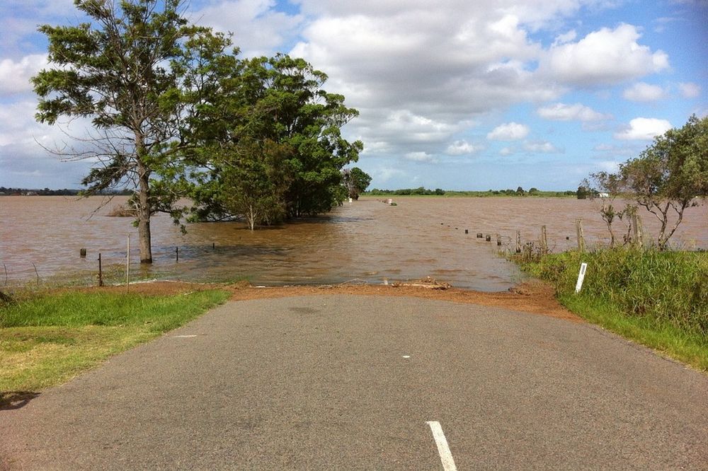Рис. 1. Автомагистраль Милан – Венеция, затопленная 1 ноября 2010 года после разрушения земляной дамбы (выделенной желтой линией), идущей вдоль берега ближайшей реки [1]