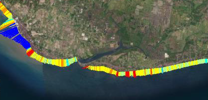 Для проведения коррекции на приливные вариации для береговой линии, выявленной на основе радиолокационного изображения, были необходимы данные об уклоне поверхности пляжа β. Они были получены по индонезийской Национальной цифровой модели рельефа (и данных батиметрии), используемой для прибрежных районов (National Digital Elevation Model for Coastal Application – DEMNAS).