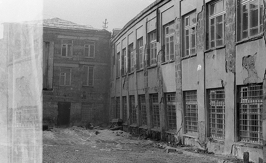 Общежитие по диагонали пересекла та аномалия, что разрушила школу. Но! На уровне межэтажных перекрытий и под коньком 4-го этажа в здании были устроены монолитные железобетонные пояса, а стены были сложены из туфа. В итоге – здание почти не пострадало. Это второе здание (первое – на территории мебельной фабрики в г. Ахуряне) в котором железобетонные пояса толщиной в 30 см сохранили здание. То есть, таких поясов оказалось достаточно.