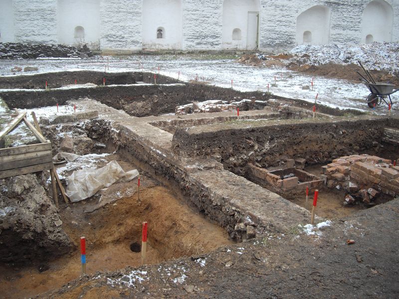 В данном случае наиболее информативными оказались результаты, представленные в виде горизонтальных амплитудных срезов по каждому участку (рис. 3). Аномалии, имеющие четкую геометрическую форму и соответствующие, по нашему мнению, контурам древних фундаментов, наилучшим образом проявляются на глубине от 0,7 до 1,2 м. По результатам геофизических работ был составлен план расположения объектов, что позволило оптимизировать работу археологов. Все геофизические построения совпали с полученными впоследствии данными археологических раскопок (рис. 4).