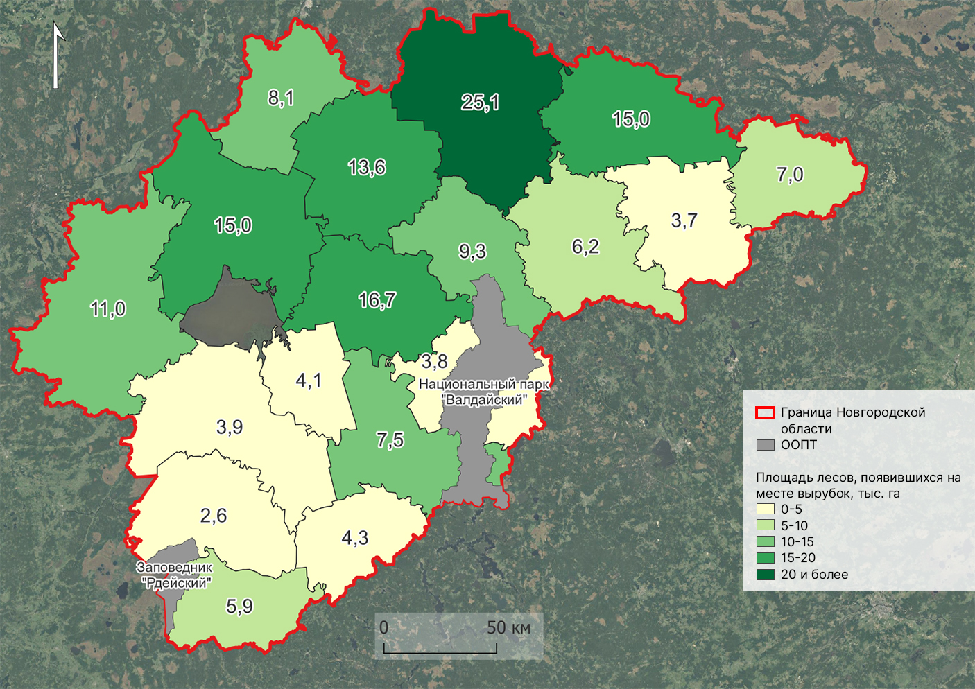 В регионе насчитывается 18 лесничеств и 2 особо охраняемые природные территории – национальный парк «Валдайский» и заповедник «Рдейский». В ходе лесовосстановительных работ наряду с лесопосадками часть территорий в пределах вырубок оставлялась под естественное заращивание. Накопленный архив космической съемки позволил отследить динамику зарастания за последние 50 лет и оценить площадь и возраст лесов, появившихся на месте вырубок в результате естественных процессов и лесопосадок. Для оценки состояния лесного хозяйства на примере Новгородской области на основе космической съемки с помощью нейросетевых технологий получен контур территорий, покрытых лесом, а также выполнен расчет площади рубок и восстановления леса по каждому лесничеству.