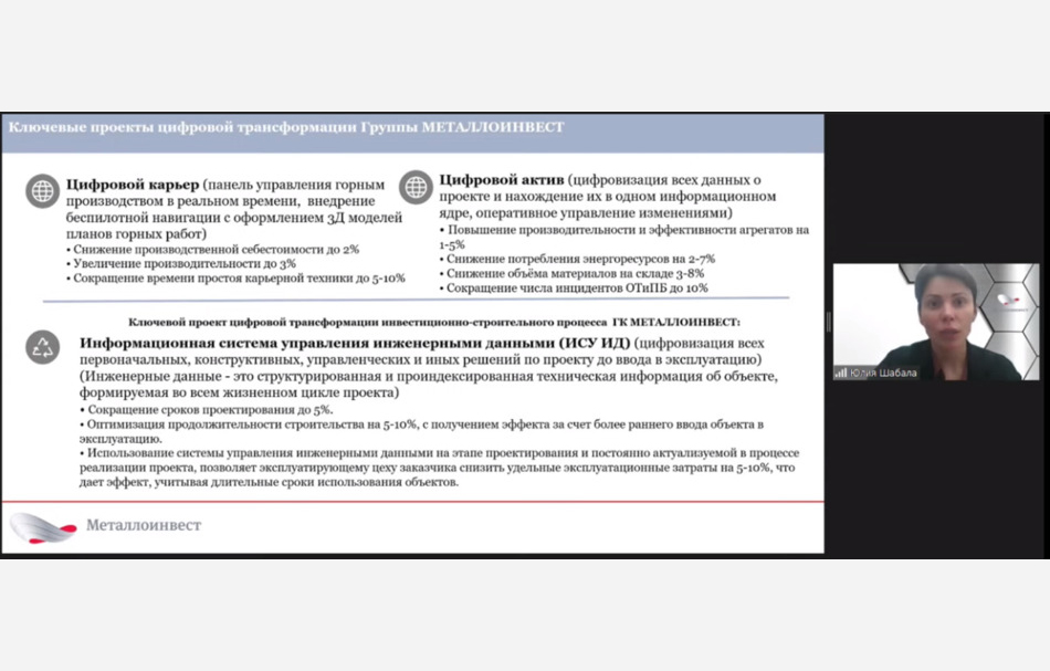 Еще одним важным направлением цифровой трансформации Металлоинвеста стала программа «Цифровой актив», собравшая все данные об производственных активах компании. Металлоинвест также реализовывает проект по внедрению информационной системы управления инженерными данными (ИСУИД), которая позволит оцифровать инженерные данные по проектам капитального строительства на всём жизненном цикле – от предпроектной проработки до ликвидации объекта. Информационная система управления инженерными данными включает в себя четыре основных модуля: PDM, автоматизированного проектирования с использованием BIM-технологий, управления проектированием и управления строительством. Пилотный проект планируется реализовать в среде ИСУИД уже в 2021 году Новая система позволит Металлоинвесту сократить сроки реализации инвестиционных проектов на 10%, создать цифровые двойники и снизить удельные эксплуатационные затраты на 5-10%.