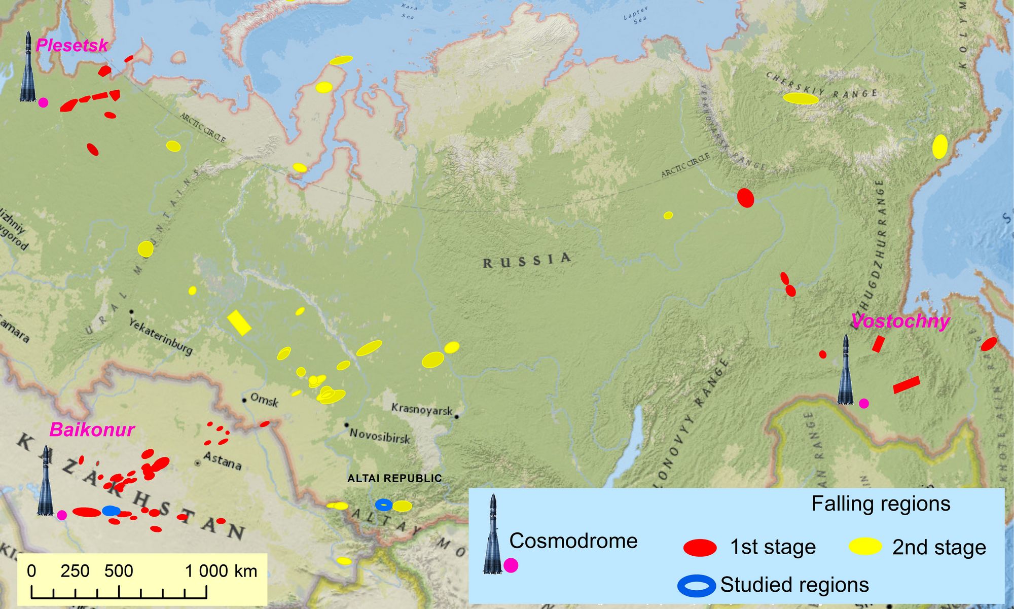Напомним, что районы падения отработавших ступеней ракет-носителей являются неотъемлемой частью инфраструктуры космодрома, так как для выведения на орбиту Земли космических аппаратов и человека необходимо использовать многоступенчатые ракеты. В Центральном Казахстане, Алтае и юго-востоке Западной Сибири находится несколько наиболее активно используемых районов падения для отработавших первых и вторых ступеней ракет-носителей, запускаемых с космодрома «Байконур». Это один из главных объектов исследования лаборатории экологической безопасности географического факультета МГУ в течение уже нескольких десятилетий.