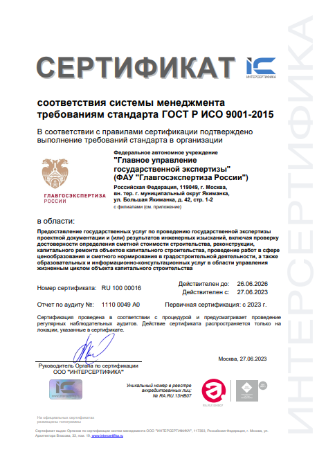 Национальный стандарт ГОСТ Р ИСО 9001-2015 – унифицированный механизм оценки качества производства и управления, который применяют государственные органы и компании в России. Наблюдательный аудит проводился в центральном аппарате, Южном и Приволжском филиалах Главгосэкспертизы России в июне 2024 года Российским органом по сертификации «Интерсертифика».