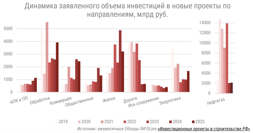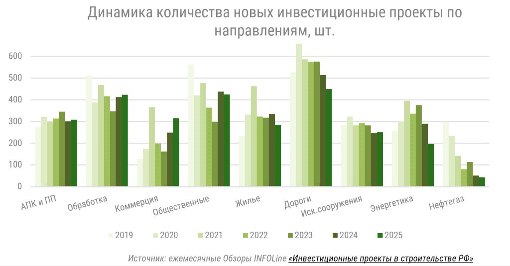 Согласно данным ежемесячного обзора INFOLine «Инвестиционные проекты в строительстве РФ», количество новых инвестиционных проектов в 2025 году демонстрирует снижение или стагнацию по большинству направлений. Всего за 2025 год заявлена реализация около 2700 новых значимых проектов (снижение на 5% по сравнению с 2024 г.) с общим объемом вложений свыше 16,9 трлн рублей, что на 1,1% больше, чем годом ранее.