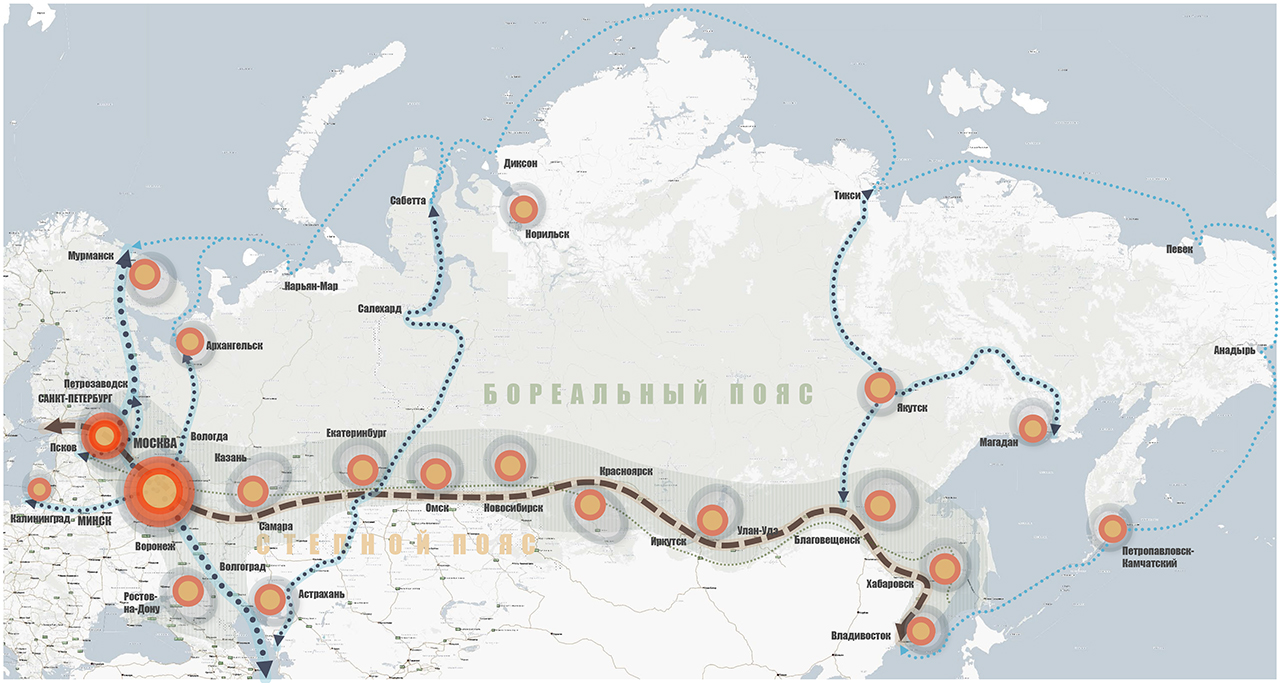 Исторически территория России осваивалась в соответствии с оценкой пригодности для обустройства, которая неразрывно связана с геологическими и природно-климатическими условиями окружения. Южная кромка бореальных лесов, пересекаемая речными долинами, переходящими в равнинные ландшафты и степной пояс, предоставляла наиболее благоприятные зоны расселения, градостроительства и закрепления рубежей. Так сформировалась макро-решетка расселенческого каркаса и ареалов оседлости вдоль широтного трансконтинентального примыкания к лесному поясу и меридиональных скреп больших рек. У нас есть все основания придерживаться этого планетарного дара.