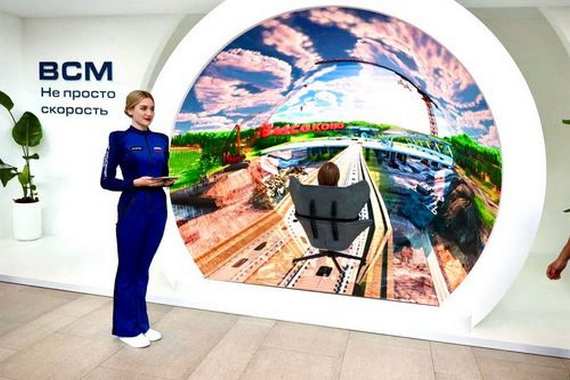 В составе экспозиции - 3d видеотоннель, где можно совершить поездку по строящейся высокоскоростной магистрали Москва - Санкт-Петербург, первой в стране.