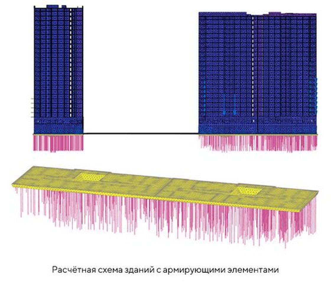 «Сложность расчётов заключалась в необходимости моделирования каждой сваи своей индивидуальной длины (от 2 до 11 метров) согласно исполнительной документации. Комплексные расчёты включали создание 3D расчётной модели в специализированном геотехническом комплексе «Plaxis» с учётом изменчивости геологического строения основания, конструктивных особенностей проектируемого здания и фактически выполненного свайного поля на площадке строительства. Компьютерное моделирование выполнялось с учётом взаимного влияния всех частей объекта (высотных корпусов и стилобатной части) на фактически выполненном армированном грунтовом основании. По результатам расчётов получены и выданы проектировщикам деформационные параметры армированного основания для учёта в расчётном обосновании железобетонного каркаса здания, выполнена проверка армирующих элементов (свай) по материалу».