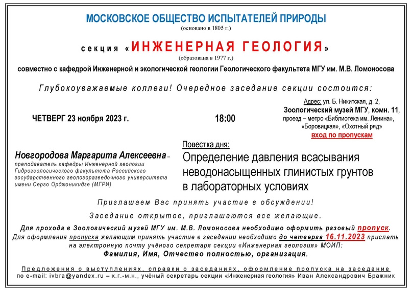 Заседание состоится по адресу: ул. Б. Никитская, д.2, Зоологический музей МГУ, комн. 11, проезд – метро «Библиотека им. Ленина», «Боровицкая», «Охотный ряд». Для оформления пропуска в Зоологический музей МГУ желающим необходимо до четверга 16.11.2023 прислать на электронную почту ученого секретаря секции «Инженерная геология» МОИП (ivbra@yandex.ru): Фамилия, Имя, Отчество полностью, организация.