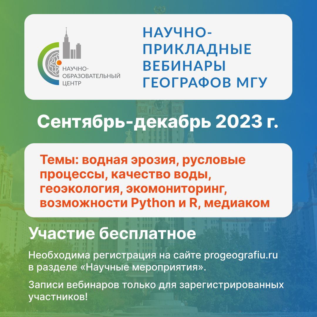 Москва. 4 сентября. Географический факультет МГУ — Открыта регистрация на тематические научно-прикладные вебинары, которые пройдут в сентябре-декабре 2023 г. Участие бесплатное! Необходимо зарегистрироваться по ссылке.