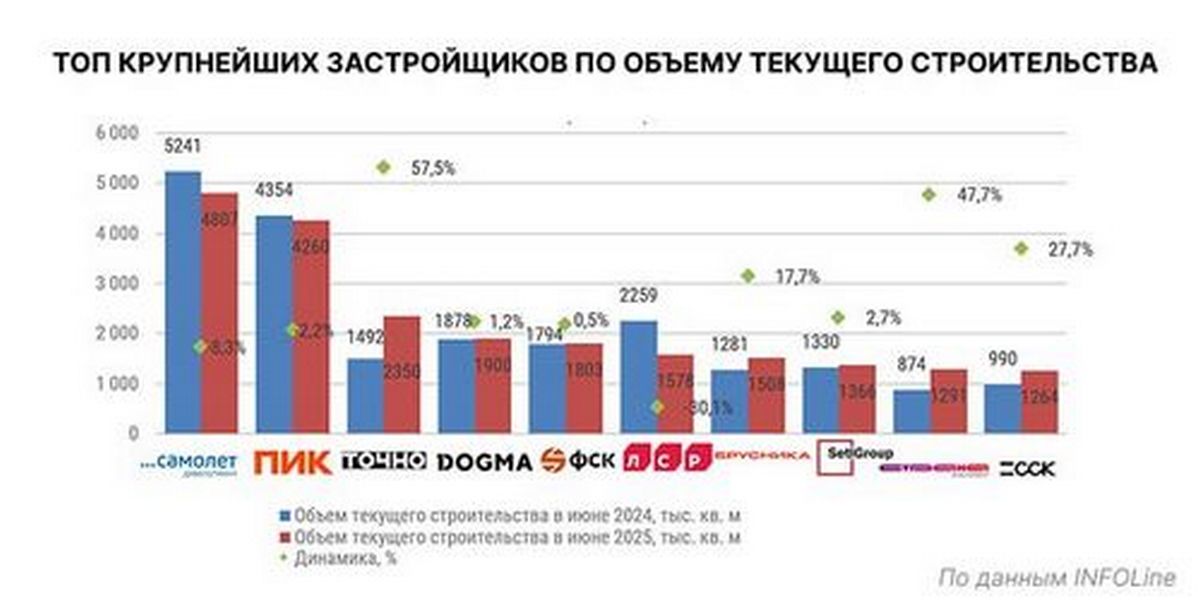 Москва. 14 августа. ГеоИнфо — По данным INFOLine, суммарный объем строящегося жилья у десяти лидирующих девелоперов в июне 2025 года составил 22,1 млн кв. м. Это на 1% больше, чем годом ранее.