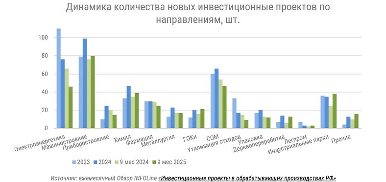 Наибольшее число новых проектов строительства и реконструкции промышленных предприятий за 9 месяцев 2025 года специалисты INFOLine отмечают в отрасли машиностроения, электроэнергетике и на рынке строительно-отделочных материалов и товаров DIY. При этом динамика заявленного объема инвестиций в новые проекты в электроэнергетике увеличилась в 3 раза по сравнению с аналогичным периодом прошлого года. Причиной послужил старт новых крупных инвестиционных проектов в отрасли.