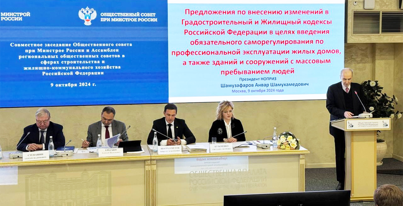 Президент НОПРИЗ Анвар Шамузафаров выступил с докладом, посвященным предложениям по внесению изменений в Градостроительный кодекс и Жилищный кодекс РФ с цель введения обязательного саморегулирования в сфере профессиональной эксплуатации жилых домов, а также зданий и сооружений с массовым пребыванием людей.