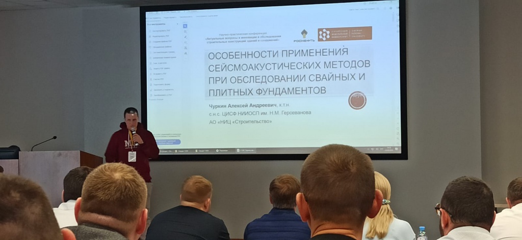 С докладом «Особенности применения сейсмоакустических методов при обследовании свайных и плитных фундаментов» выступил старший научный сотрудник лаборатории новых видов свайных фундаментов НИИОСП им. Н.М. Герсеванова АО «НИЦ «Строительство» Алексей Чуркин.