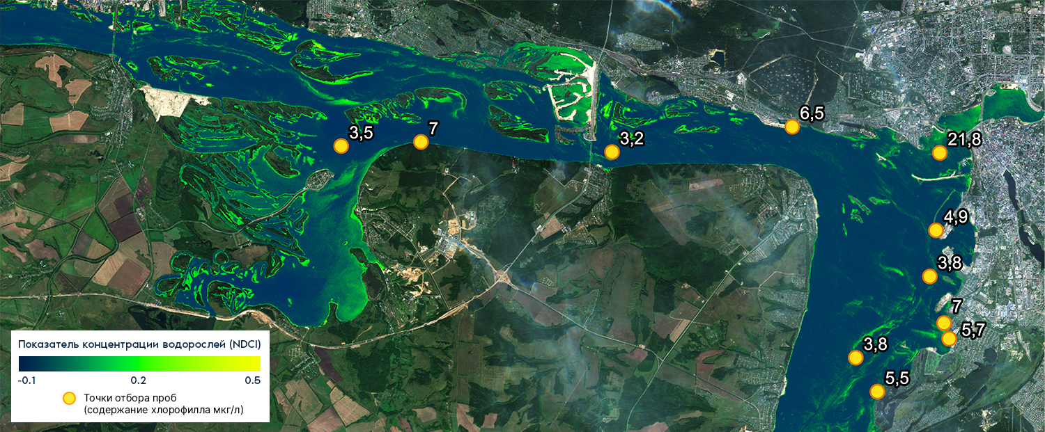 Для мониторинга «цветения» были использованы космические снимки высокого пространственного разрешения участков Куйбышевского и Чебоксарского водохранилищ за летние месяцы 2020-2022 годов. Дешифрирование проводилось с использованием снимков отечественного космического аппарата «Канопус-В», данных из открытых источников и спутниковых изображений с орбитальных группировок дружественных государств. Для каждого изображения был рассчитан индекс NDCI (Normalized Difference Chlorophyll Index), позволяющий определить концентрацию хлорофилла на поверхности воды.