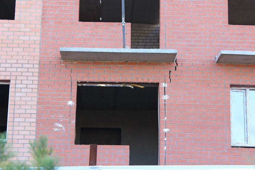 В мае один дом покрылся глубокими трещинами. Его успели возвести почти до 4 этажей. Трещины в некоторых местах с ладонь, разорвана кирпичная кладка, треснули бетонные блоки в подвале, разошлись стыки плит перекрытия… Без лишнего шума власти, подрядчик, авторский и технический надзоры дружно пытались дом спасти. Видимые трещины внутри объекта замазали, фундамент усилили монолитными плитами, сделали разгрузочный монолитный пояс для облицовочного кирпича на уровне плит перекрытий 3-го этажа. Ситуацию это не спасло. Дом продолжал «садиться», разорвало контрольные маяки, трещины расширились, здание накренилось.
