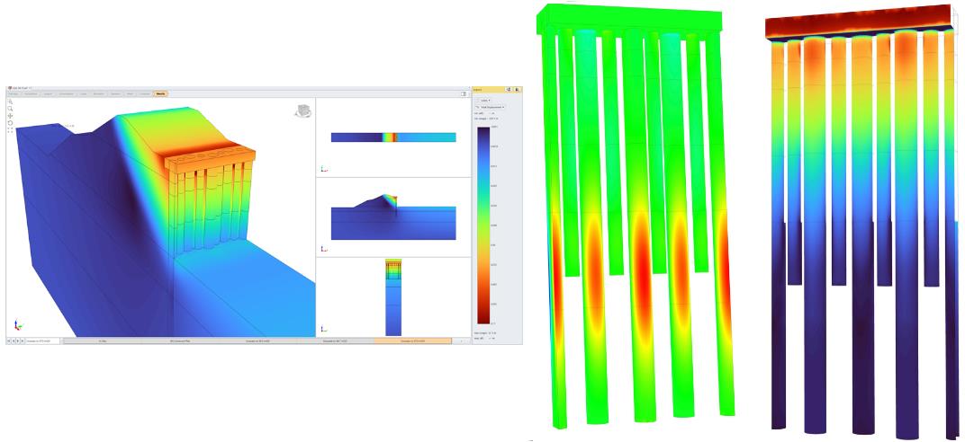 3D конечноэлементный анализ поведения подпорной стенки из свай