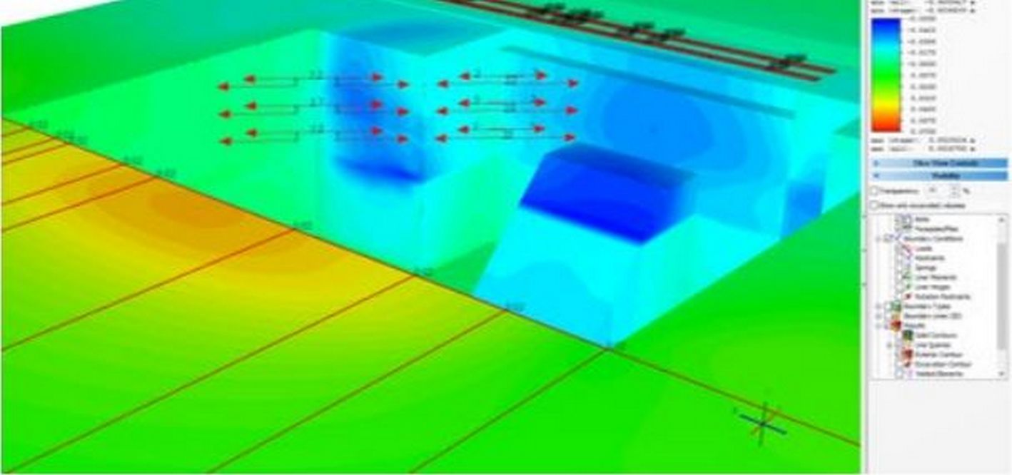 Первоначальная численная оценка реакций грунта и установленной системы крепления котлована была выполнена с использованием двумерного конечноэлементного анализа в программе Rocscience RS2 (рис. 5) и анализа методом конечных разностей в программе FLAC 3D, разработанной американской компанией Itasca Consulting Group. Однако для более детальной и реалистичной оценки того, как строительство повлияло на существующую инфраструктуру, было проведено трехмерное численное моделирование на основе метода конечных элементов в программе Rocscience RS3.