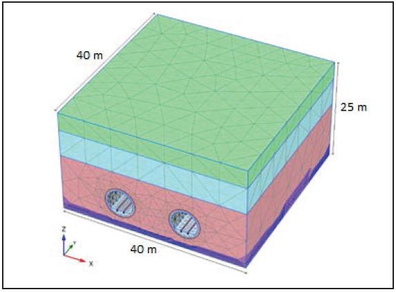 На рисунке 2 показана модель двойной системы тоннелей в массиве грунта, полученная в PLAXIS 3D.