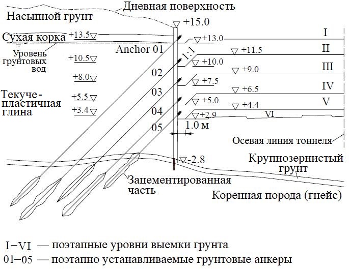На рисунке 8 показана выемка грунта внутри подпорных стен (шесть этапов сверху вниз с I по VI) в сечении 1/840N. Этапы I–V сопровождались установкой и предварительным натяжением анкеров (01–05 на рис. 8).