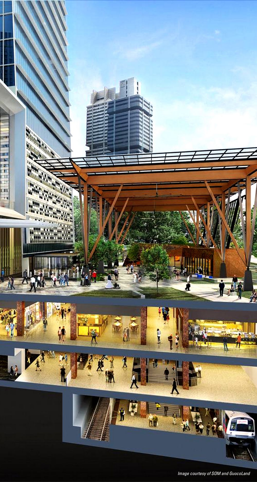 Масштабнейшим и сложнейшим проектом высотного строительства в Сингапуре стало создание многофункционального комплекса «Башня Гуоко» (или «Гуоко Тауэр» – Guoco Tower) стоимостью 3,2 млрд сингапурских долларов (рис. 2). В этот комплекс, построенный в оживленном деловом районе Танджонг Пагар недалеко от южного побережья острова, входят: 64-этажное здание высотой почти 290 м, имеющее офисные и жилые помещения; гостиничный блок средней этажности; шестиэтажный подиум для использования в коммерческих целях; трехуровневая подземная часть глубиной 18 м с паркингом и прямым выходом к станции метро; парк на крыше подземной части (рис. 3). На сегодняшний день это самое высокое здание в Сингапуре.