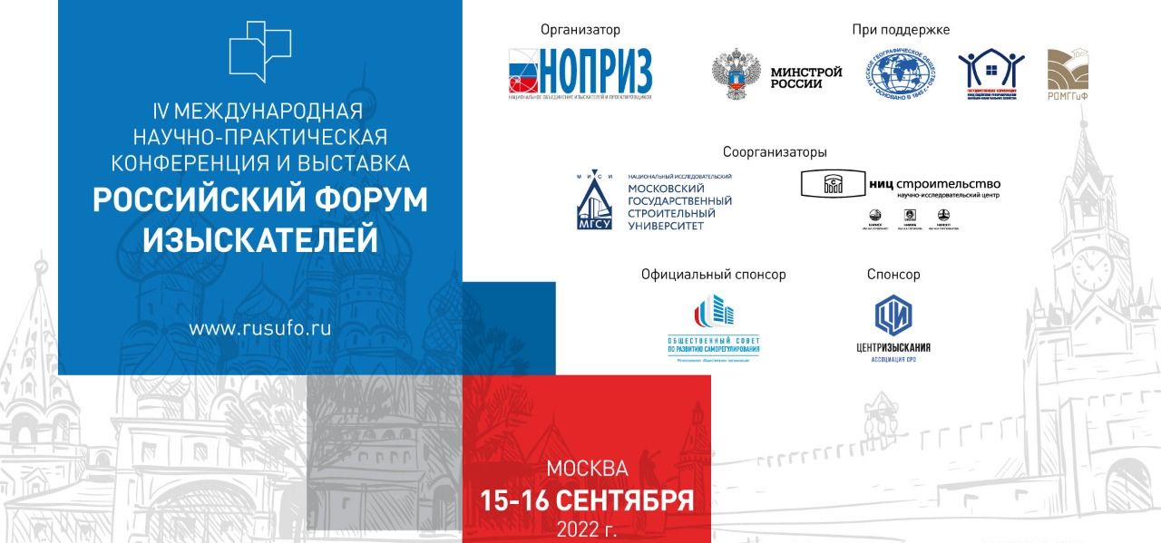 15-16 сентября 2022 года в Москве, в здании Национального исследовательского Московского государственного строительного университета (НИУ МГСУ) состоится IV Международная научно-практическая конференция «Российский форум изыскателей». Форум пройдет при поддержке Министерства строительства и жилищно-коммунального хозяйства Российской Федерации, Русского географического общества, Фонда содействия реформированию жилищно-коммунального хозяйства и Российского общества по механике грунтов, геотехнике и фундаментостроению. Организаторами конференции выступают Национальное объединение изыскателей и проектировщиков (НОПРИЗ), Национальный исследовательский Московский государственный строительный университет и Научно-исследовательский центр «Строительство».