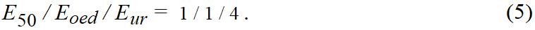 Модель HS также использует в качестве входного параметра жесткость грунта при стандартных трехосных испытаниях в дренированных условиях (Е50 — Ред.). (Изменение сдвиговой жесткости учитывается моделью так же, как в формулах (2) и (3). — Ред.)