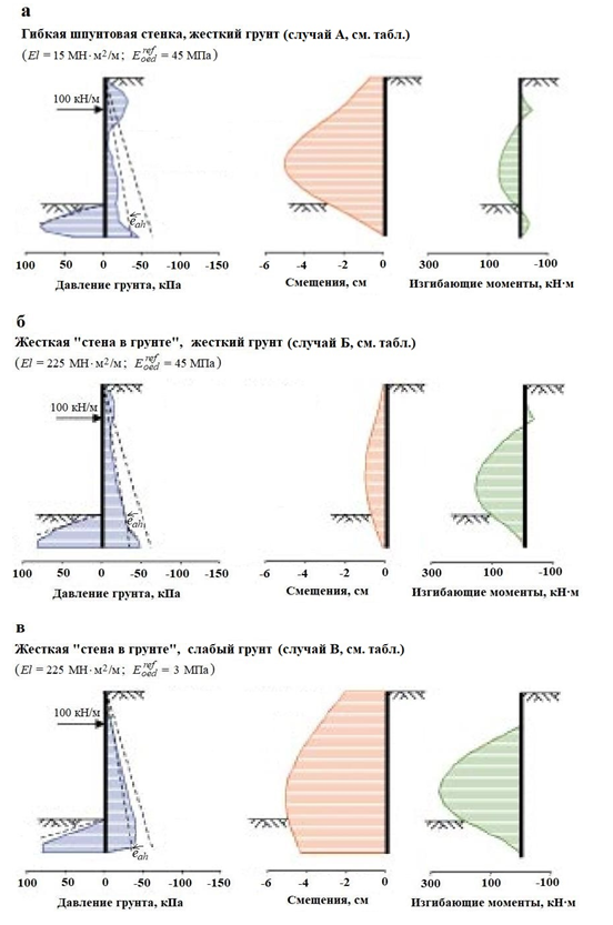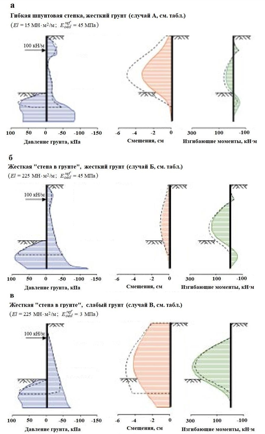 При анализе поведения жесткой подпорной стенки («стены в грунте») в жестком грунте (случай Б, см. табл.) получаются примерно такие же результаты, как и при использовании аналитической методики расчетов Блюма. В этом случае будут иметь место классические активные давления грунта, по крайней мере ниже уровня крепления стенки.