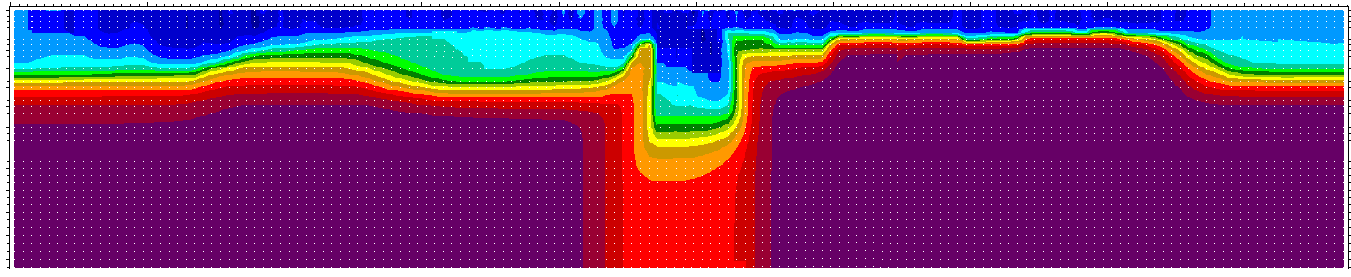 На рисунке 2 видно, что многолетнемерзлые грунты слагают сравнительно маломощный горизонт в интервале глубины 6–12 м. Ниже этого горизонта находятся грунты в талом состоянии, причем на псевдо-геоэлектрическом разрезе хорошо прослеживается граница между суглинками и супесями в районе пикета ПК 36 (36 м). Полученные геофизические данные дали основание довести часть разведочных скважин с проектных глубин 7–10 м до входа их забоев в талые грунты.