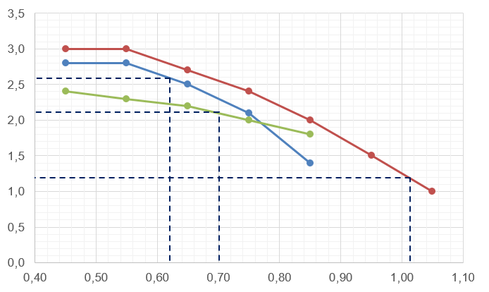 Давайте представим, что нам необходимо найти moed для супеси с коэффициентом пористости 0,7. Для этого от числа 0,7 на оси X мы проведем параллельную оси Y линию fc до нашего отрезка. Затем от точки пересечения проведем к оси Y уже параллельно оси X линию cd. И получим значение moed – 2,3 графику (рис. 2).