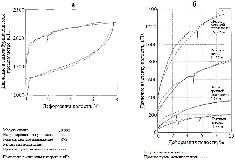 На рисунке 4, а показан пример корректирования (подбора, аппроксимации – fitting) кривой для глинистого грунта, а на рисунке 4, б – соответствующий пример для песка. Эти примеры основаны на результатах испытаний самозабуривающимся прессиометром. Однако моделирование может применяться также и к данным испытаний прессиометром, помещаемым в предварительно пробуренную скважину, или вдавливаемым конусным прессиометром при условии, что коррекция кривой фокусируется на последней части кривой расширения или кривой разгрузки (например, Ferreira, Robertson, 1992). Для слабоструктурированного гранитного сапролита было предложено, чтобы метод корректирования (fitting) кривой испытаний самозабуривающимся прессиометром для участка нагружения давал показатели свойств, типичные для параметров максимальной прочности на сдвиг, а для участка разгрузки – более типичные для поведения в критическом состоянии (Schnaid et al, 2000).