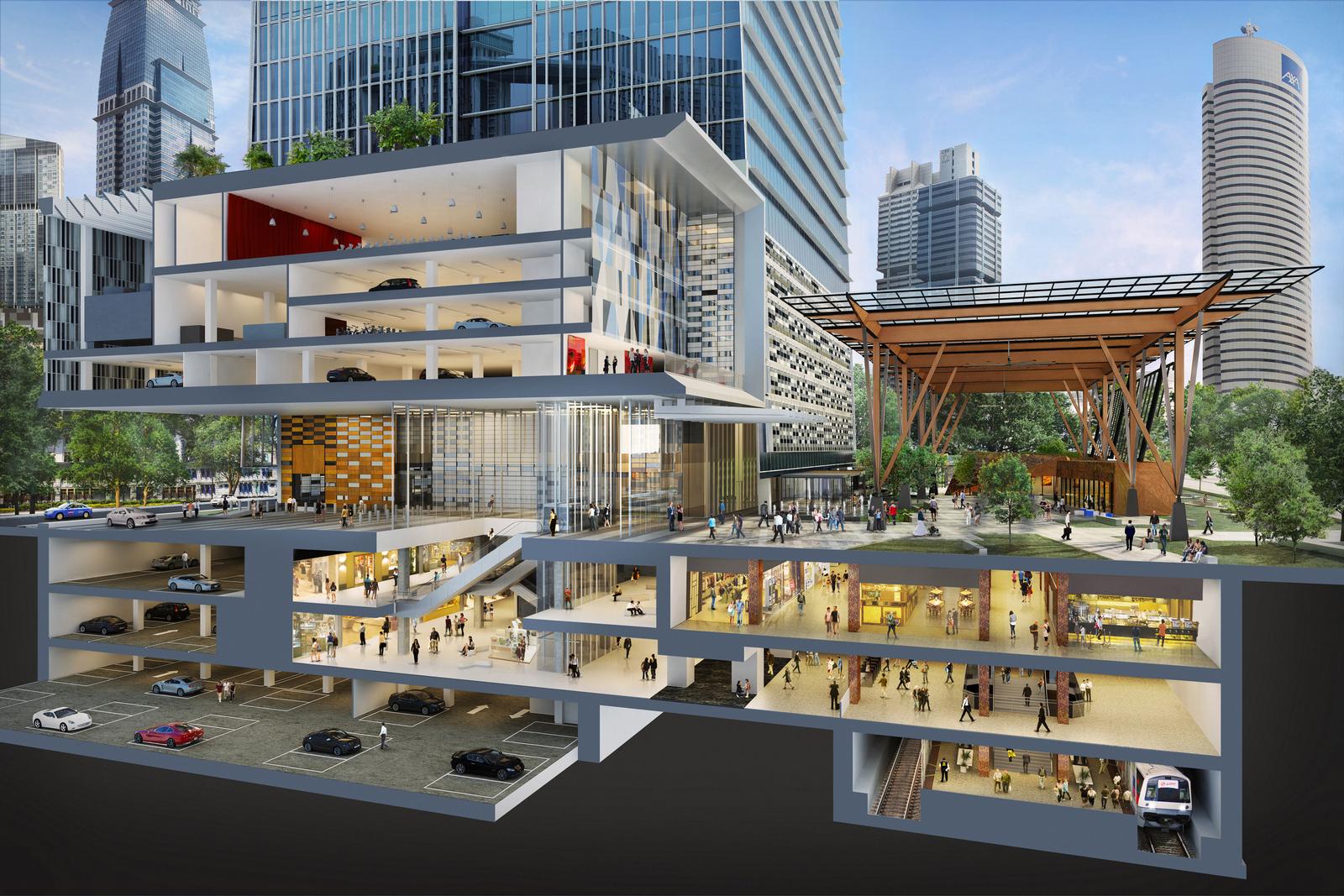 Масштабнейшим и сложнейшим проектом высотного строительства в Сингапуре стало создание многофункционального комплекса «Башня Гуоко» (или «Гуоко Тауэр» – Guoco Tower) стоимостью 3,2 млрд сингапурских долларов (рис. 2). В этот комплекс, построенный в оживленном деловом районе Танджонг Пагар недалеко от южного побережья острова, входят: 64-этажное здание высотой почти 290 м, имеющее офисные и жилые помещения; гостиничный блок средней этажности; шестиэтажный подиум для использования в коммерческих целях; трехуровневая подземная часть глубиной 18 м с паркингом и прямым выходом к станции метро; парк на крыше подземной части (рис. 3). На сегодняшний день это самое высокое здание в Сингапуре.
