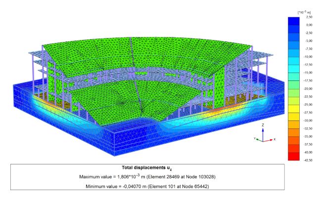 Для моделирования влияния работ по реконструкции сотрудники института выбрали PLAXIS. Этот программный продукт позволил им задать оптимальную последовательность строительных работ с точки зрения деформации, напряженного состояния и плотности грунтов. Использование 3D модели улучшило показатели надежности геотехнического прогноза смещений основания стадиона для нового строительства и реконструкции существующих зданий и сооружений, тем самым повысив операционную эффективность при подготовке окончательного проекта. Цифровое решение Bentley способствовало разработке более точных прогнозов, повышению надежности строительства и снижению стоимости фундамента за счет детального анализа грунтов.