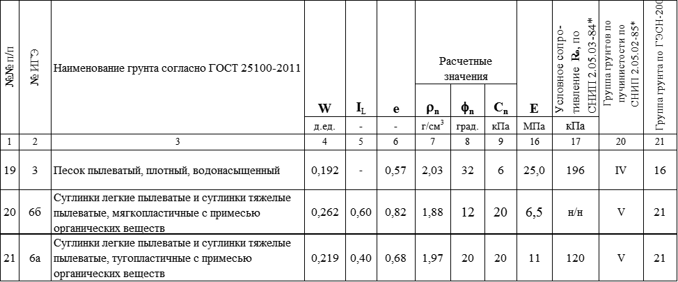 Рассмотрим пример выполнения расчетов по первому из обозначенных подходов. В таблице 1 приведен фрагмент ведомости физико-механических характеристик грунтов из отчета по инженерно-геологическим изысканиям.