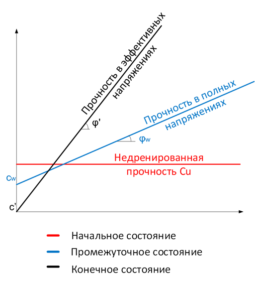 Прочность слабых водонасыщенных грунтов описывается как минимум тремя состояниями и тремя условиями прочности: