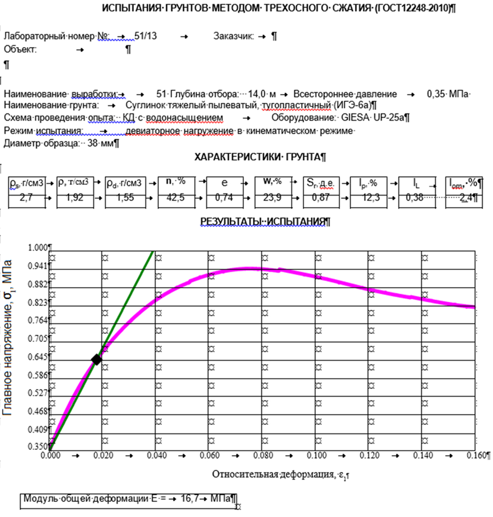 Таким образом, приведенное в таблице значение, равно как и значение из другого протокола трехосных испытаний в инженерном (ручном) расчете осадки непригодно.