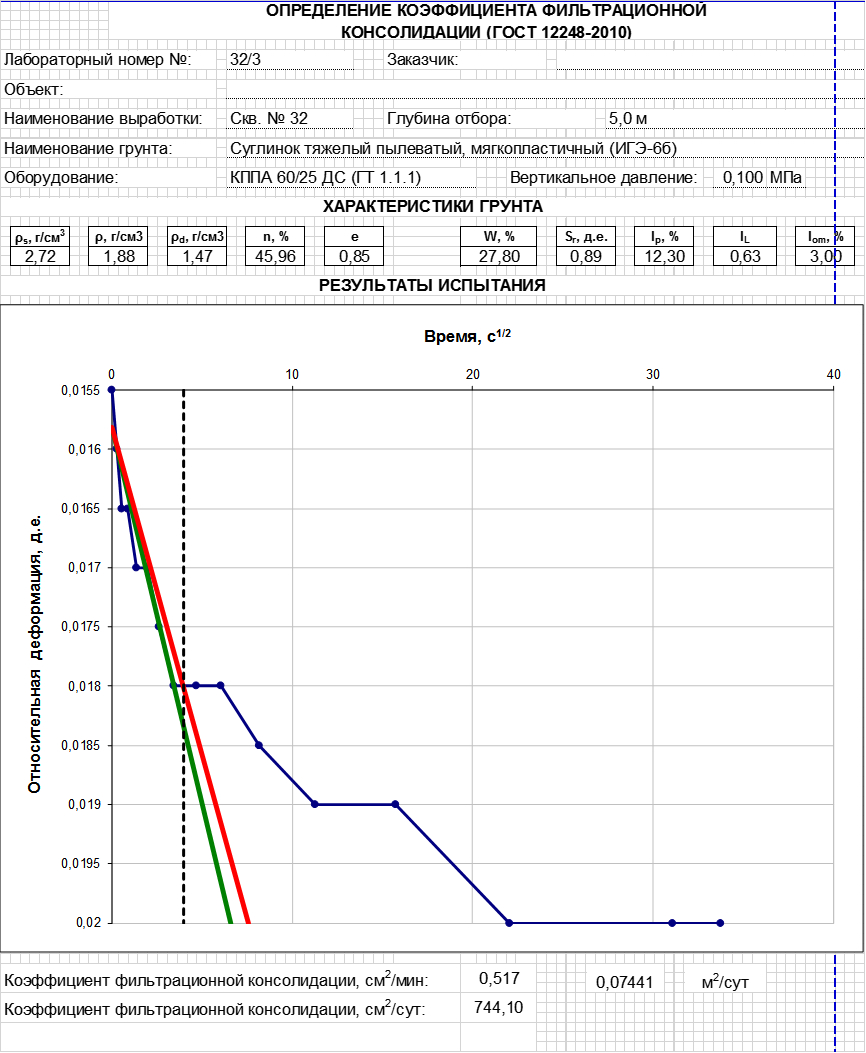 Поскольку в транспортном строительстве нет критерия величины осадки, оценка расчета по деформациям ведется на основе ее скорости, т.е. консолидации (например, 2 см/год для укладки асфальтобетона). Для выполнения расчета консолидации необходимо иметь соответствующий параметр. На рисунке 15 приведен пример протокола консолидационных испытаний. В таком протоколе необходимо проверить соответствие расчетной нагрузки от сооружения и давления в опыте. В данном примере давление в приборе составило 100 кПа, что близко к давлению под подошвой насыпи (103 кПа), следовательно, использование этого показателя правомерно. В практике чаще случается так, что испытания в лаборатории производят при других (как правило, существенно больших) давлениях, чем вес насыпи, что делает эти результаты бесполезными.