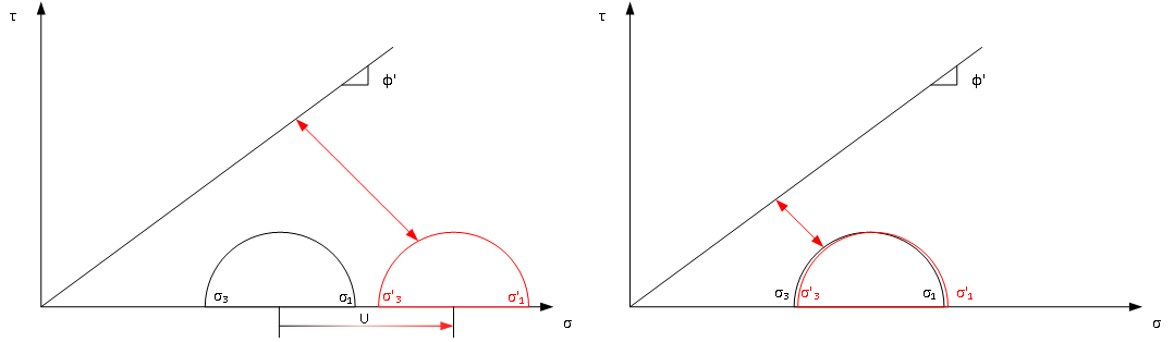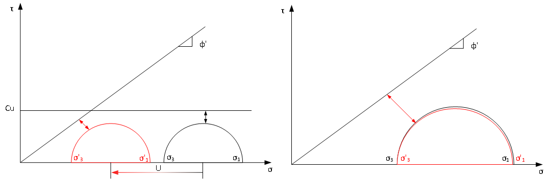 Дренированные условия соответствуют медленной разработке котлована или достаточной фильтрационной способности грунта для обеспечения рассеивания образовавшегося отрицательного порового давления. В таком случае круги в полных и эффективных напряжениях одинаковые (U=0).