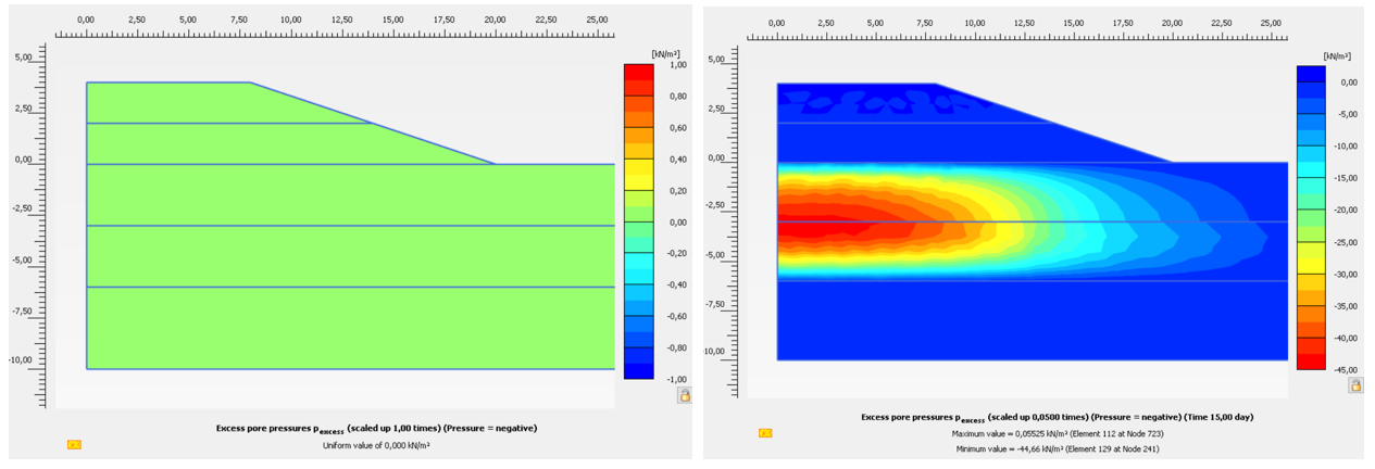 Типовой пример – возведение насыпи (дамбы) на слабом глинистом основании. Известно, что быстрая отсыпка может привести к разрушению, а медленная с перерывом позволяет полностью использовать мобилизованное сопротивление сдвигу грунта в процессе консолидации и во многих случаях отказаться или существенно снизить затраты на мероприятия по усилению сооружения или стабилизации основания. Причиной такой разной реакции грунтового основания на внешнее воздействие является избыточное поровое давление. На рисунке 2 показаны результаты расчетов порового давления при отсыпке насыпи на глинистые водонасыщенные грунты. Величина рассчитанного избыточного порового давления для недренированных условий составила -44 кПа.