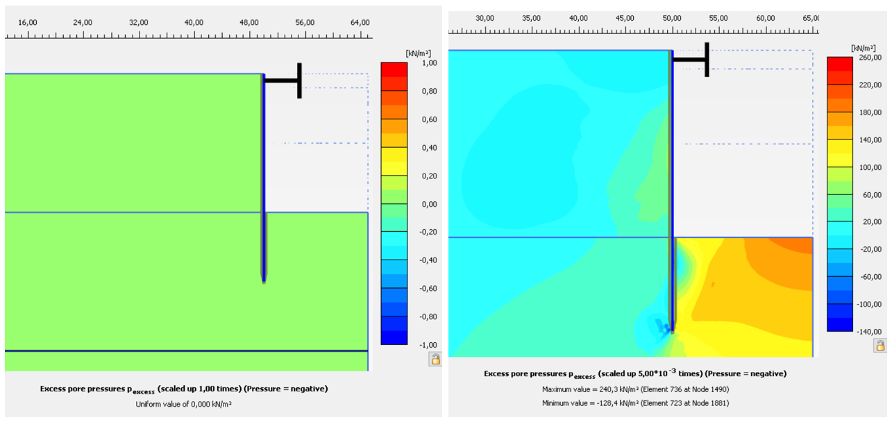 Рассмотрим влияние этого принципа на результаты расчетов устойчивости котлована. На рисунке 7 показаны результаты расчетов последней стадии экскавации грунта для дренированных (нулевое поровое давление) и недренированных (поровое давление +240 кПа) условий.