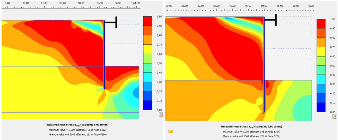 В соответствии с принципом Терцаги величина сопротивления сдвигу будет зависеть в каждой точке от рассчитанного порового давления в соответствии с рисунком 6. Как видно из рисунка 8, ниже дна котлована, где присутствует поровое давление, сопротивление сдвигу выше, чем в варианте с нулевым поровым давлением (дренированные условия).