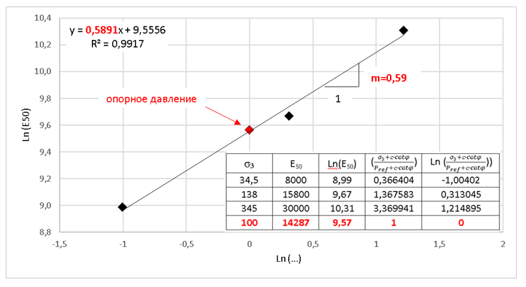 Таким образом, в этом примере несмотря на отсутствие трехосного испытания с обжатием 100 кПа, в качестве опорного давления принято Pref=100 кПа, а соответствующий опорный трехосный модуль определен путем пересчета и составил