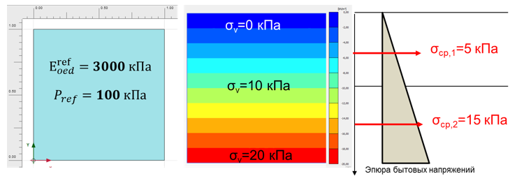 В этом примере рассмотрен условный массив грунта размером 1x1 м. прикладываются напряжения от собственного веса (initial phase + gravity loading). На рисунке 18 показана расчетная схема и результаты расчетов в виде распределения напряжений от собственного веса в схеме и на эпюре. Цифрами обозначены напряжения на кровле, середине и подошве слоя, а на эпюре показаны средние значения. Для дельнейших рассуждений слой условно разделен на два по 0,5 м.