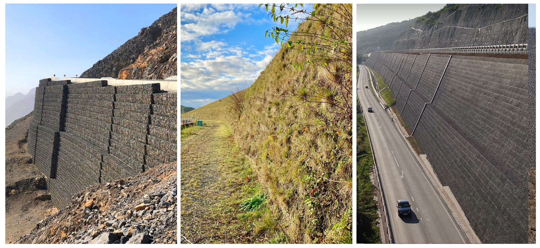 В качестве яркого примера можно привести использование системы «Зеленый Террамеш®» для ликвидации ошибки проектного решения при строительстве одного из дорожных тоннелей в Грузии. При реализации проекта были выполнены вертикальная подрезка горы и искусственное удлинение тоннеля с обеих сторон на 60 м. После завершения строительства подрезанная часть горы стала неустойчивой, а выполаживание склона уже не представлялось возможным. Эту проблему удалось решить с помощью устройства армогрунтового сооружения на основе системы «Зеленый Террамеш®», которое обеспечило устойчивость сползающего склона и гармонично вписалось в существующий ландшафт после его озеленения (рис. 4).
