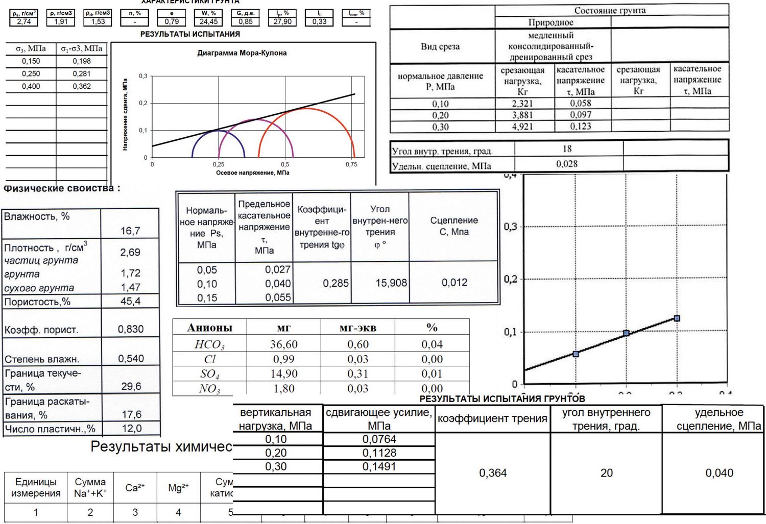 Хочется отметить, что в настоящее время в инженерно-геологической нормативной документации отсутствует термин, обозначающий «протокол (паспорт, бланк) испытания грунта», как документ, в котором отражены результаты испытания. Есть лишь упоминание в п. 4.6 ГОСТ 12248-2010, которое никак не закреплено и не расшифровано: «…результаты опыта выводятся на компьютер в форме паспорта (протокола) испытания». Также в п. 6.7.1 СП 47.13330.2012 и п. 5.1.9 СП 22.13330.2011, устанавливающих состав инженерно-геологического отчета требуется: приводить графики и таблицы, но не протоколы испытаний.