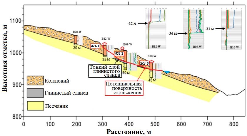 Как уже упоминалось выше, в средней и нижней части склона на исследуемой территории под коллювием залегает тонкий слой глинистого сланца толщиной 2,0–4,5 м, который также является непроницаемым, и просочившаяся дождевая вода скапливается поверх этого слоя, вызывая смещение грунта вниз по склону (на рисунке 6 показаны результаты инклинометрических измерений в скважине B09-W). (В отношении последовательности залегания слоев у авторов здесь, по-видимому, также была ошибка в изложении на английском языке, которая была исправлена переводчиком в соответствии, например, с рисунками 6 и 11, a. – Ред.)