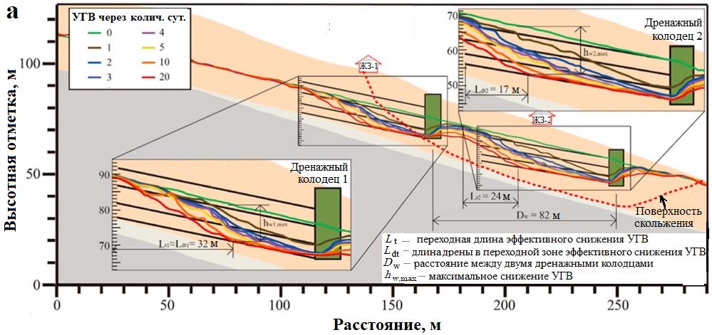 Теоретически расчетная длина горизонтальных дрен Ld (равная 50 м в данном исследовании) должна быть увеличена за пределы потенциальной поверхности скольжения для УГВ в пределах этой поверхности. Как показано на рисунке 13, a, переходная длина дрены Lt1 для дренажного колодца 1 расположена далеко за пределами ППС, а зона снижения УГВ (область между исходным и пониженным уровнями грунтовых вод) только частично расположена внутри ППС. При этом уровень грунтовых вод вниз по склону от дренажного колодца 1 имеет тенденцию постепенно восстанавливаться до исходного, а дренажным колодцем 2 за 10 дней подземного дренажа достигается только небольшое снижение УГВ.