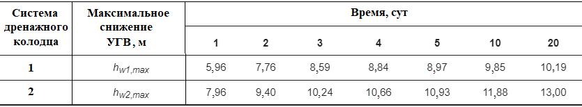 Таблица 5. Максимальные величины снижения УГВ при работе системы подземного дренажа (KS = 1 × 10–4 см/с)