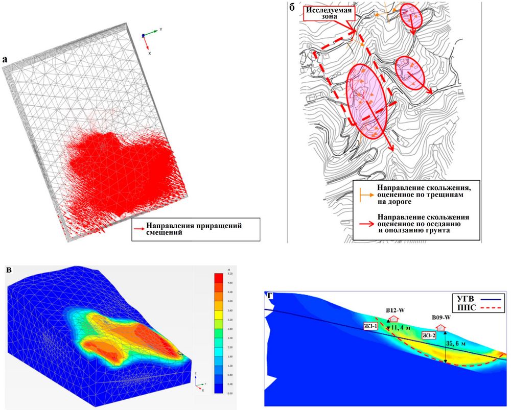 На рисунке 15, a показано поле полных приращений смещений (в процессе анализа устойчивости cклона методом итерационного снижения прочности), которое направлено на юго-восток и близко к основному направлению движения грунта, оцененному по направлениям трещин растяжения и линий оседания и оползания, как показано на рисунке 15, б. Кроме того, расчетная потенциальная зона скольжения, показанная на рисунке 15, в, также приближается к измеренной зоне движения грунта, обведенной эллипсом на рисунке 15, б. Далее, сравнивая рисунок 15, г с рисунком 6, можно увидеть, что рассчитанные (минус 11,4 м для B12-W; минус 35,6 м для B09-W) и измеренные (минус 12 м для B12-W; минус 36 м для B09-W) высотные отметки потенциальной поверхности скольжения от дневной поверхности по профилю B-B' (см. рисунок 4) практически совпадают друг с другом. В результате эффективность численной модели может быть верифицирована еще раз.